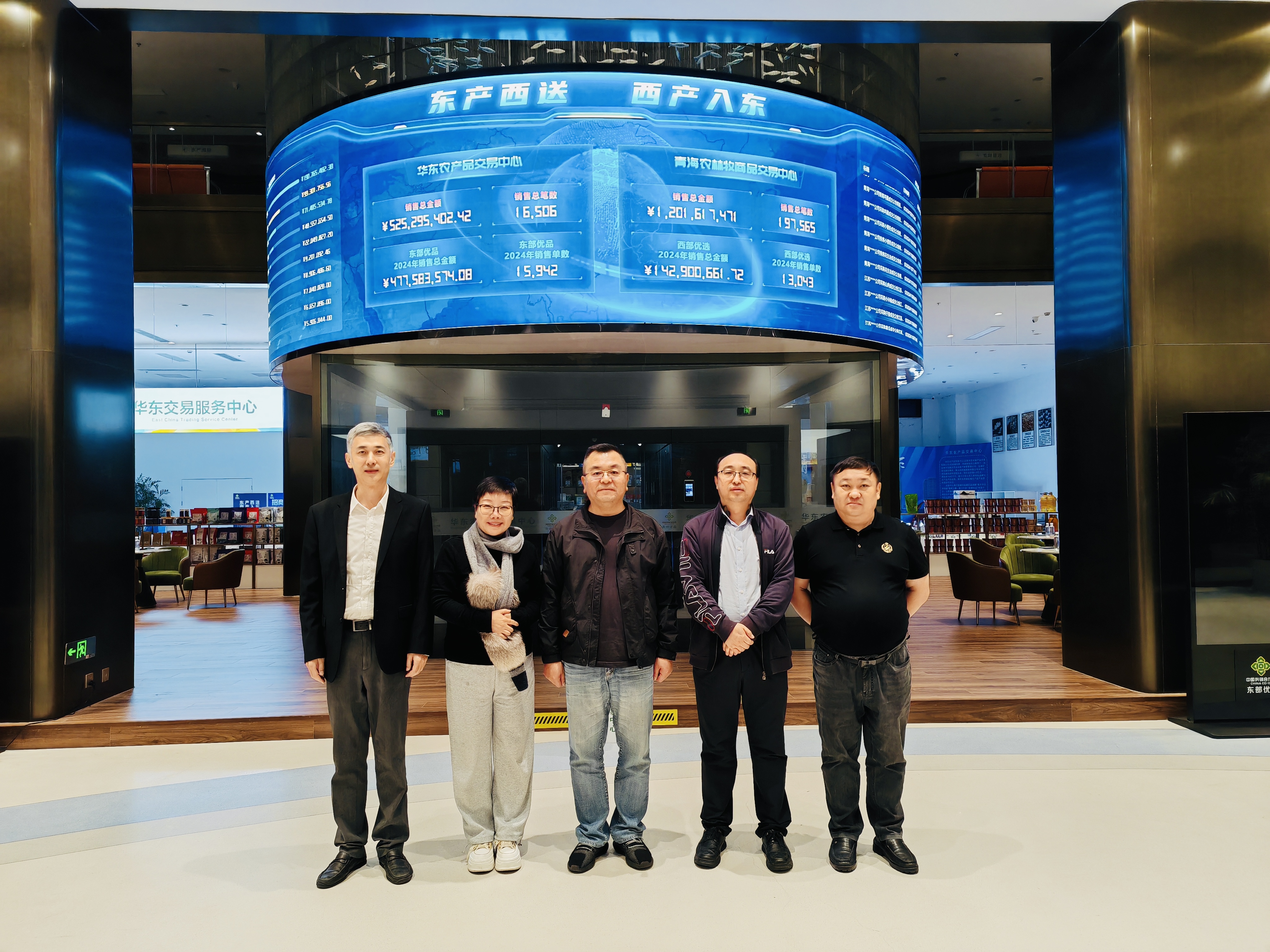 簽約儀式后,新立訊科技集團董事長(兼青海、華東、川藏交易中心董事長)毛霖,與各單位出席簽約代表共同參觀華東農(nóng)產(chǎn)品交易中心。