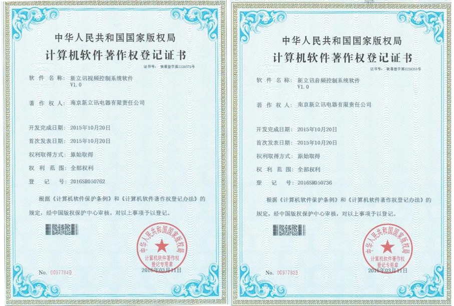 2016年3月11日, 新立訊企業作為自身擁有核心技術、創新能力的國家高新技術企業,公司高新技術研發中心研發團隊所研發的“新立訊視頻系統控制軟件V1.0”以及“新立訊音頻系統控制軟件V1.0”獲得了由國家版權局頒發的“計算機軟件著作權登記證書”。至此新立訊企業擁有發明專利1項,實用新型專利39項,外觀專利7項,計算機軟件著作權5項,商標3項。