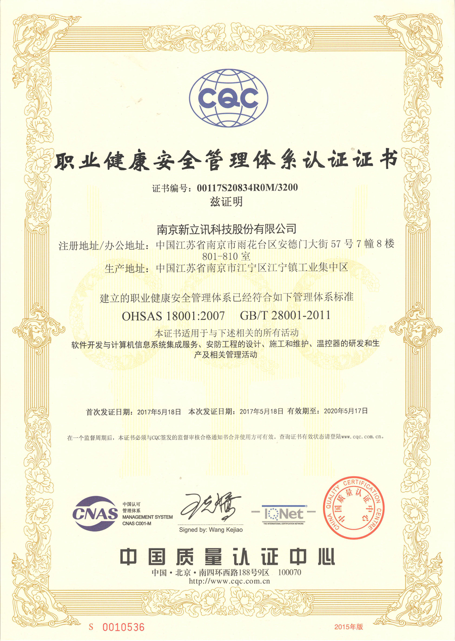 2017年5月,新立訊經中國權威認證機構CQC(中國質量認證中心)全面、嚴格的評定與審核,正式通過ISO9001國際質量管理體系認證、ISO14001國際環境管理體系認證、OHSAS18001職業健康安全管理體系認證三大國際管理體系認證,并獲得相關證書。證書涵蓋范圍包括軟件開發與計算機信息系統集成服務,安防工程的設計、施工和維護,溫控器的研發和生產及相關管理活動。這意味著新立訊成為CNAS(中國合格評定國家認可委員會)、IQNet(國際認證聯盟)和IAF(國際認可論壇)三方共同認可的綜合數據應用服務商,更標志著新立訊的質量管理、環境管理、健康安全管理等已達到國際先進水平。同時此三項證書的取得是對新立訊企業管理理念和質量管理水平的充分肯定,也為企業向社會提供優質的產品和服務提供了強有力的保障。
