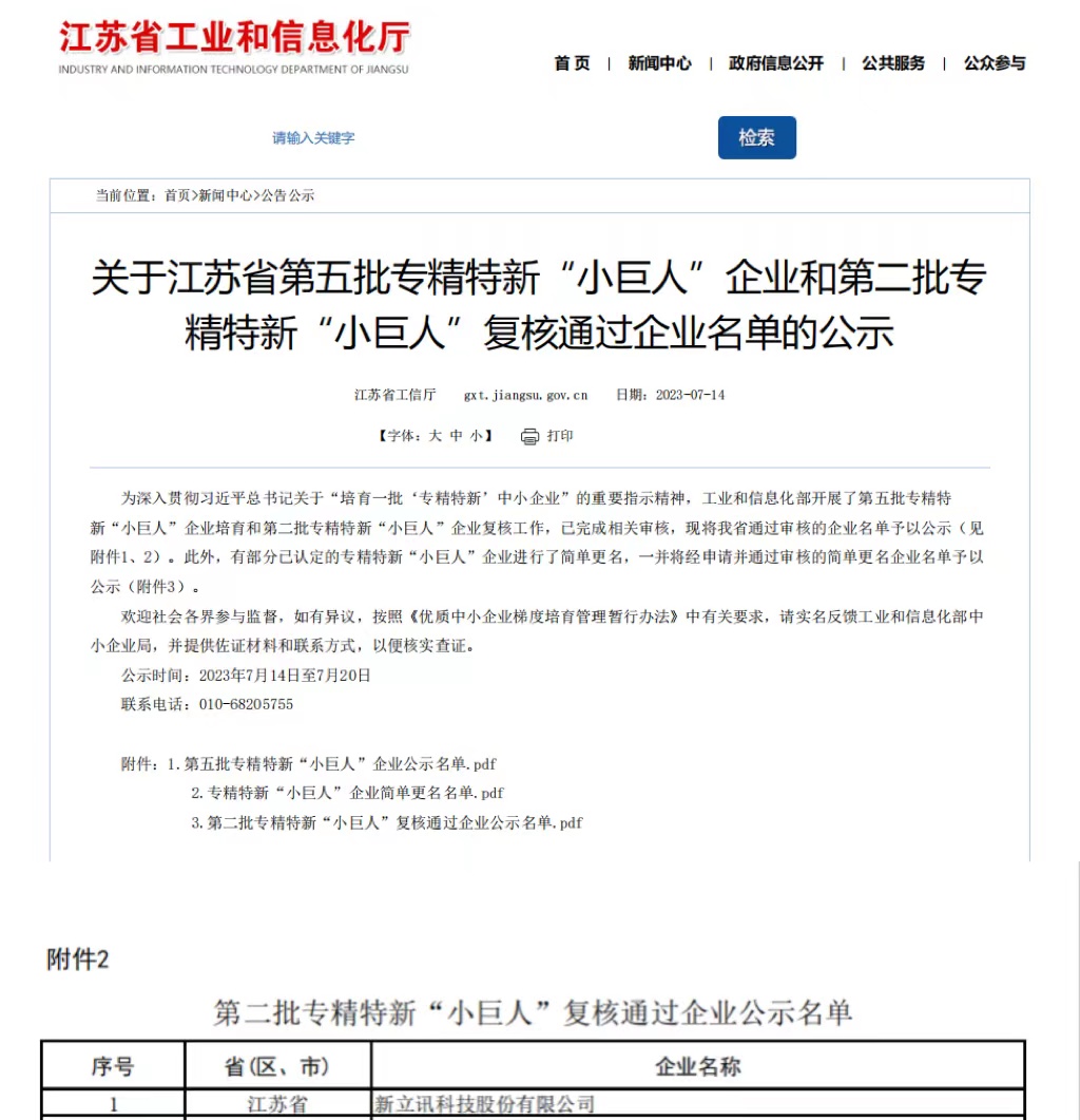 2023年7月20日,新立訊科技股份有限公司“第二批全國專精特新小巨人企業”復核通過,江蘇工信發布。