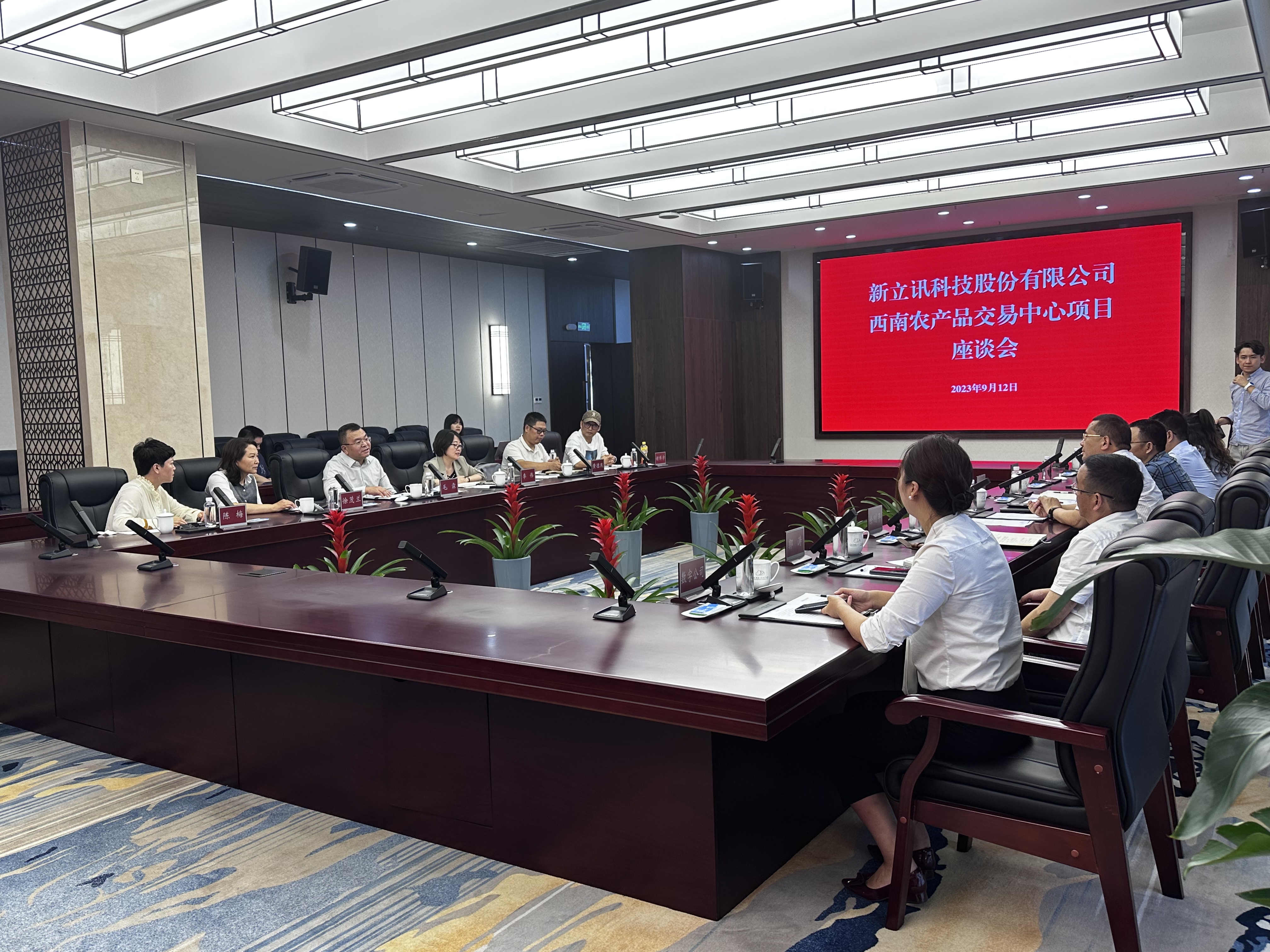 2023年9月12日,新立訊青海農林牧商品交易中心華東農產品交易中心董事長兼總經理毛霖、新立訊副總經理李偉一行赴四川雅安市大數據產業園進行實地考察,雅安市政協副主席,雅安經開區黨工委副書記、管委會主任李陽軍,雅州新區管委會黨工委委員、管委會副主任、二級巡視員余剛平,四川雅州新區發展集團黨委副書記、總經理周顯祥等領導會見毛霖一行并舉行座談。